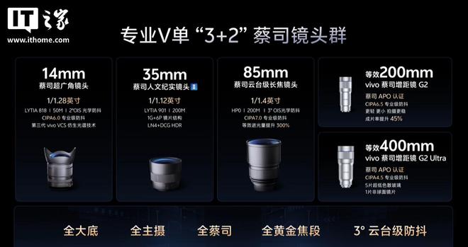 据介绍,vivo X300 Ultra 手机拥有“3+2”蔡司镜头群,超广角是 1/1.28 英寸的索尼 LYTIA 818,内置第三代 vivo VCS 仿生光谱技术、蔡司 T * 镀膜,防抖等级达到 CIPA 6.0,等效进光量相比上代提升 100%。