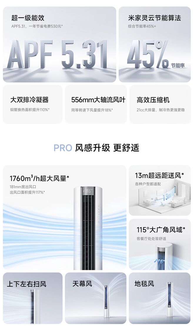 官方强调该空调搭载米家灵云节能算法,可实现 45% 的节能率,通过 AI 按需智能调节运行状态,避免无效能耗。超一级能效标准下,APF 值达到 5.31,每年号称可省电 884 度,节省电费约 530 元。
