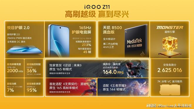 性能方面,iQOO Z11 搭载天玑 8500 满血版处理器,采用第二代台积电 4nm 全大核架构,搭配 Monster 超核引擎先知调度器与闪电加速器,安兔兔综合跑分超 262 万。内置 7K 冰穹 VC 液冷散热系统,保障性能持续稳定释放。游戏适配层面,该机独家首发《逆战:未来》原生 165 帧模式,满音量、满亮度运行 30 分钟平均帧率达 164FPS,首批适配《无畏契约:源能行动》原生 165FPS,同时覆盖《王者荣耀》144 帧、《使命召唤》等多款热门手游高帧模式,电竞体验拉满。