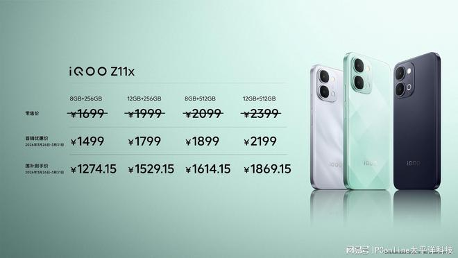 iQOO Z11x 共 4 个版本,8GB+256GB 首销价 1499 元(国补 1274.15 元)、12GB+256GB 首销价 1799 元(国补 1529.15 元)、8GB+512GB 首销价 1899 元(国补 1614.15 元)、12GB+512GB 首销价 2199 元(国补 1869.15 元)。