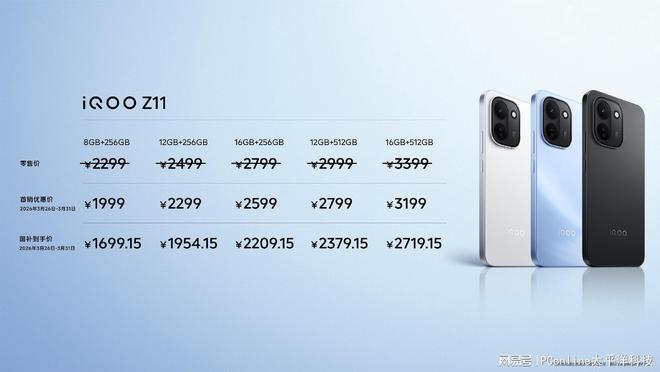 售价方面,iQOO Z11 共 5 个版本,8GB+256GB 首销价 1999 元(国补 1699.15 元)、12GB+256GB 首销价 2299 元(国补 1954.15 元)、16GB+256GB 首销价 2599 元(国补 2209.15 元)、12GB+512GB 首销价 2799 元(国补 2379.15 元)、16GB+512GB 首销价 3199 元(国补 2719.15 元)。