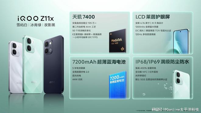 iQOO Z11x 同样支持 IP68/IP69 防尘防水,后置 5000 万像素索尼超清主摄,配备立体声双扬声器、全功能 NFC、红外遥控与光环呼吸灯,提供冰青绿、雪屿白、夜影黑三款配色,是 LCD 党护眼长续航优选。