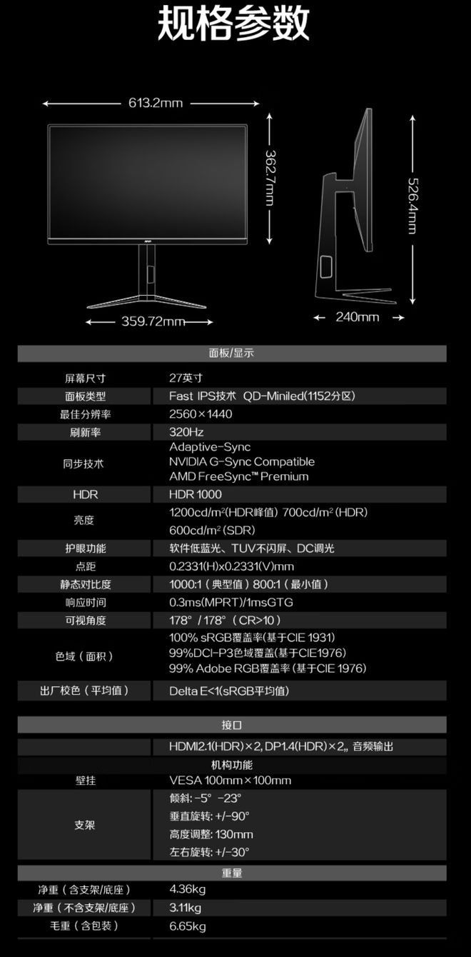 该机配备一块 2560x1440 分辨率 320Hz Fast IPS 面板,采用全阵列直下式 Mini LED 背光技术,拥有 1152 个独⽴背光控制分区,SDR 亮度 600nits、HDR 峰值亮度 1200nits,获得 VESA DisplayHDR 1000 认证。显示器同时拥有 0.3ms MPRT 响应时间、1ms GtG 响应时间,色域覆盖 99% Adobe RGB、99% DCI-P3,色准 ΔE<1,支持 VESA Adaptive-Sync 自适应同步。