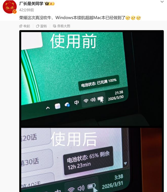 科技自媒体博主厂长是关同学实测发现,荣耀 MagicBook Pro 14 2026 经过 6 小时的日常模拟使用后,剩余电量 65%,系统提示仍可使用 12 小时 23 分钟。该博主评价表示,荣耀真的做到了让 Windows 本续航超越 Mac 本。