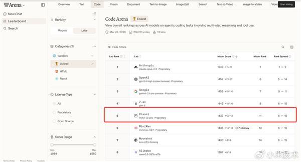 在衡量实验室综合研发实力的Lab Rank(实验室排名)维度,小米拿下Text Arena(Arena Expert)全球第四、Code Arena全球第五的优异成绩。