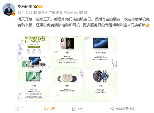 4月3日消息,日前,华为终端BG首席执行官何刚微博发文宣布,华为4月服务日将于今天开启,活动持续至4月5日,共持续3天。