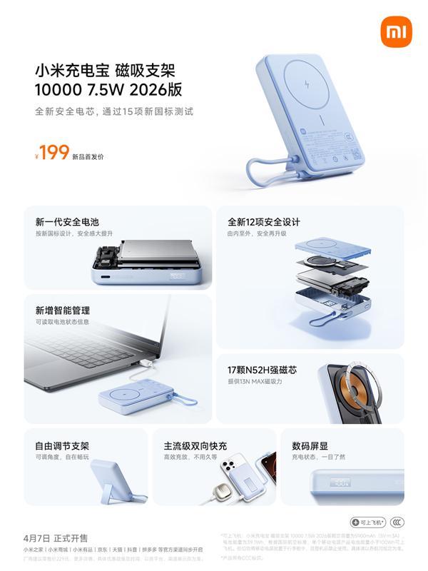 4月8日消息,小米充电宝磁吸支架10000 7.5W 2026版正式开售,首发到手价199元,这是小米首款新国标充电宝。