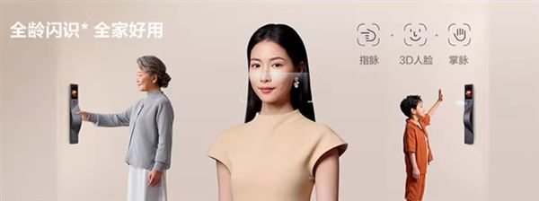 解锁层面搭载多眸三维精准识别方案,支持指脉、掌脉、3D人脸三种生物识别方式,掌脉识别响应时间仅0.18秒,误识率低于0.001%,老人、儿童或身高差异人群均可快速解锁。
