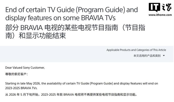 IT之家援引索尼官方支持页面披露的信息,受影响的设备涵盖 2023 年至 2025 年发布的 6 款机型: