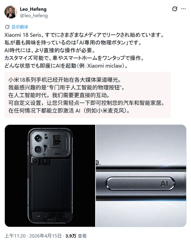 4 月 16 日消息,消息源 @leo_hefeng 昨日(4 月 15 日)在 X 平台发布推文,分享了一组渲染图,展示了小米 18 Pro 手机,重点凸显机身侧面的 AI 按键,支持启动 AI 功能、控制智能家居及小米汽车。