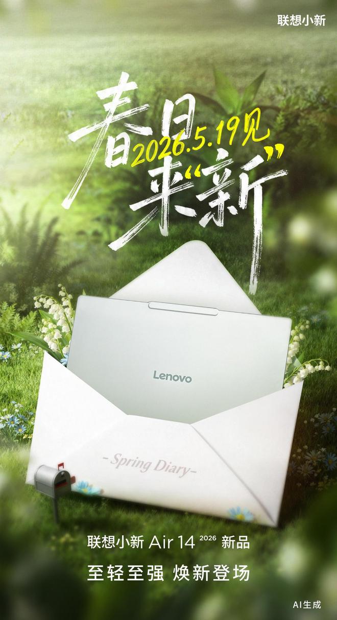 4 月 20 日消息,联想 (Lenovo) 小新官方今日上午表示,2026 款小新 Air 14 笔记本电脑将于 5 月 19 日发布,口号为“轻如纸鸢逐风,美若春信初开”,主打轻薄。