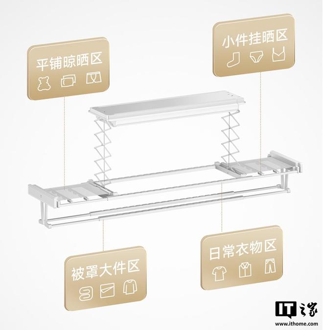 这款新品采用 4 分区(平铺晾晒区、小件挂晒区、被罩大件区、日常衣物区)晾晒,内衣鞋袜不混晾;共有 94 个晾晒位(38 个开放式挂槽位、32 个旋转晾衣夹挂位、20 个伸缩细杆挂位、2 个晾晒网、2 根晾被杆)。