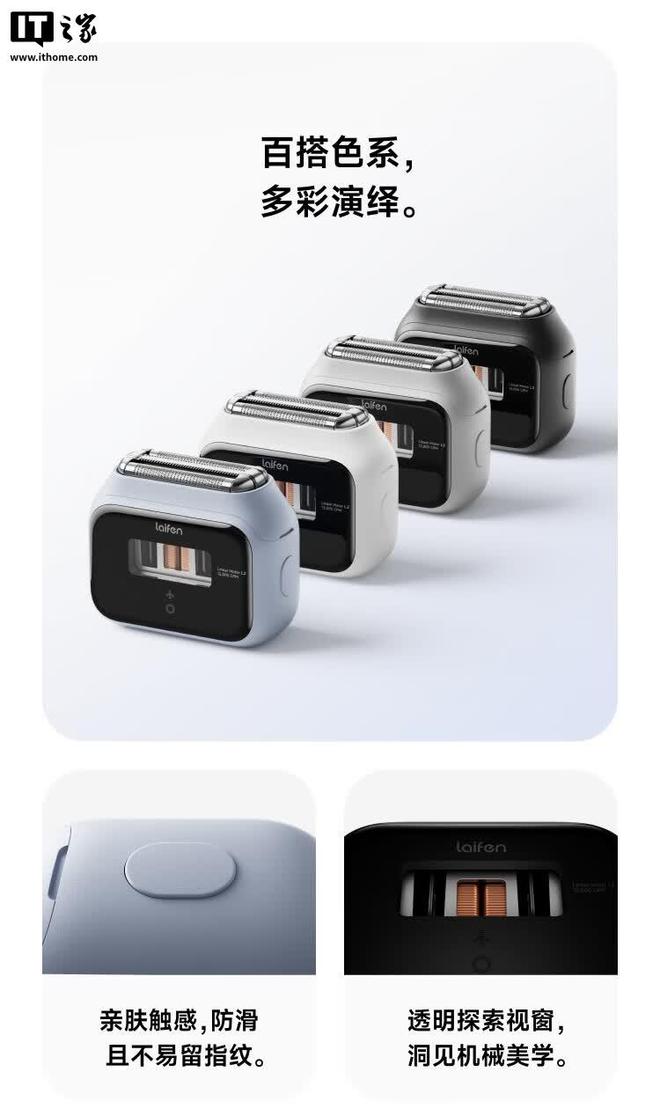 徕芬往复式剃须刀 P3 标准版有曜石黑、极地白、海湾蓝、薄雾灰四种颜色可选;外壳采用亲肤触感,防滑且不易留指纹;剃须刀正面设计有透明探索视窗,可以看到内部结构。