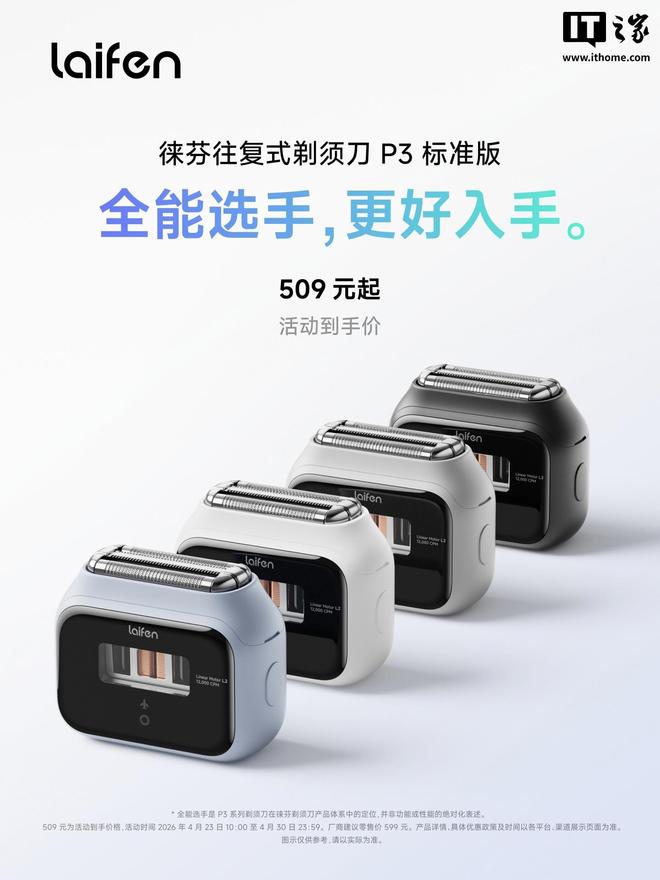 4 月 23 日消息,徕芬科技今日宣布,往复式剃须刀 P3 标准版开售,509 元起。