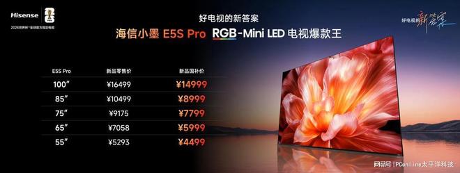 4月22日海信正式发布小墨E5S Pro,主题定位“好电视的新答案”。RGB-Mini LED显示技术首次被下探至4499元起的主流价位段,红绿蓝三原色纯净直出、42%蓝光削减、30%功耗降低,这些原本属于旗舰万元机的技术参数,如今成为四千五百元档位的标配。一个七年销冠的产品线,为什么要下出这么狠的一步棋?