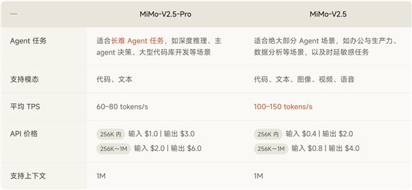 MiMo-V2.5则主打原生全模态Agent能力,涵盖图像、音频与视频,具备更高的平均推理速度,支持100万上下文长度。