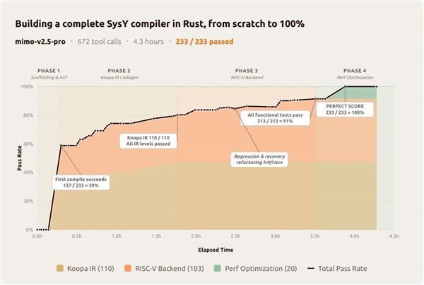 北大本科生完成该项目通常需要数周时间,而MiMo-V2.5-Pro仅用4.3小时、调用672次工具即完成全部开发,并在隐藏测试中取得233/233满分。
