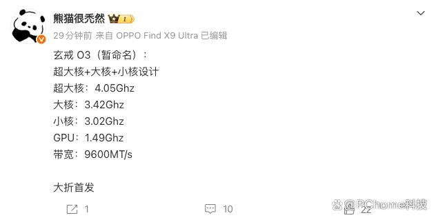 4月29日消息,数码博主“熊猫很禿然”曝光了小米自研玄戒O3芯片的参数信息,采用超大核+性能大核+小核设计,超大核4.05Ghz、大核3.42Ghz、小核3.02Ghz;GPU为1.49Ghz,带宽9600MT/s。